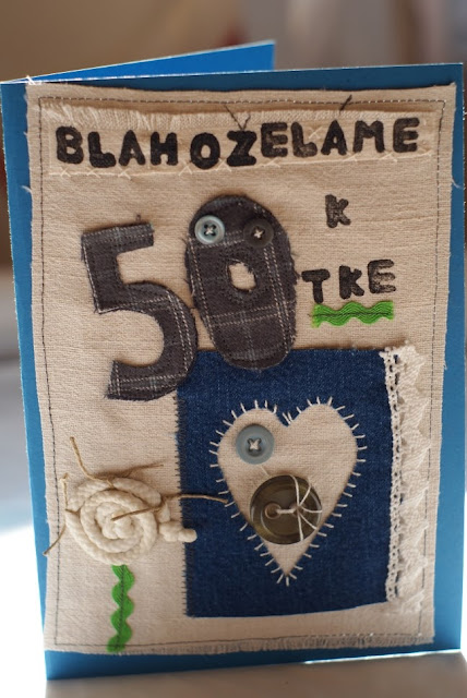 Čoskoro bude mať jeden z mojich švagrov okrúhle jubileum, tak som sa pokúsila o originálnu pohľadnicu - môj prvý látkový scrapbookový počin. Bola to veľmi zaujímavá a tvorivá práca, použila som čo mi padlo pod ruku, text je orazítkovaný Adelkinimi písmenkovými razítkami a farbou na textil (aj keď tú som si vlastne mohla aj šetriť, pohľadnicu úrčite prať nebude:-) Snáď sa bude páčiť, druhú takú úrčite nedostane.